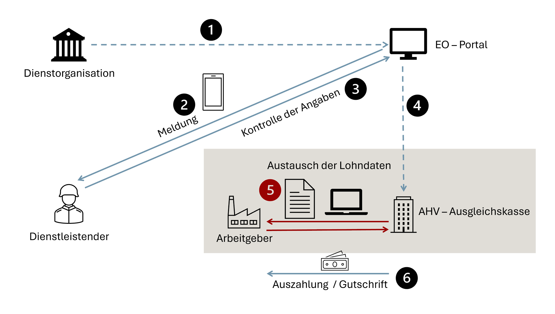 Die Erwerbsersatzordnung (EO) entschädigt Personen, die ihre Arbeit vorübergehend unterbrechen (Militär- oder Zivildienst, Einsätze im Rahmen von Jugend und Sport). Während dieser Zeit haben sie Anspruch auf ein EO-Taggeld, das den Erwerbsausfall teilweise ausgleicht. Grundlage für die Berechnung dieses Taggelds sind Lohndaten des Arbeitgebers, die an die zuständige Ausgleichskasse übermittelt werden.